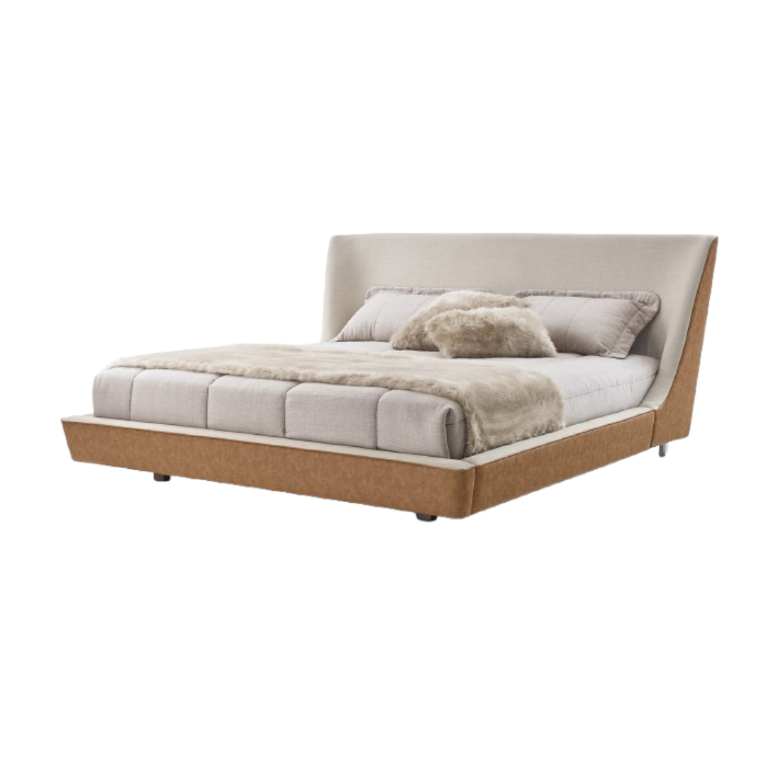 Com uma cabeceira em formato de concha, sustentada por uma estrutura angular revestida de espuma e tecido, esta cama sofisticada e aconchegante encanta a todos à primeira vista.