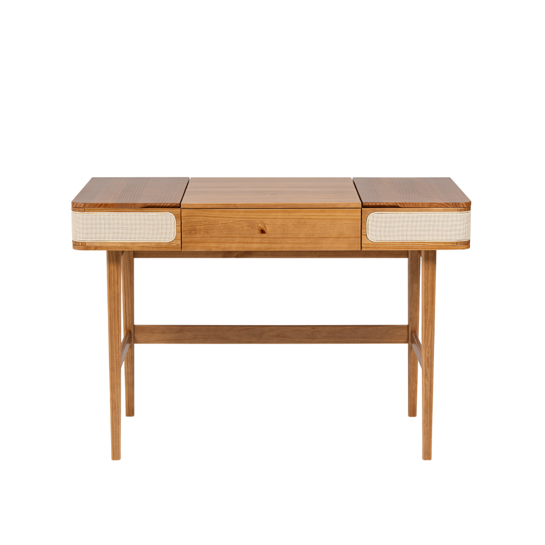Inspirada no estilo provençal, a Escrivaninha Viena traduz elegância, funcionalidade e leveza em um único móvel. Seu design clássico com linhas suaves é enriquecido pelos detalhes em palhinha natural, que conferem charme artesanal e sofisticação atemporal. O tampo articulado revela um espaço interno funcional, ideal para organização de documentos e objetos do dia a dia, enquanto a gaveta frontal complementa a praticidade da peça. Perfeita para home offices, quartos ou ambientes de estudo, a Escrivaninha Viena transforma qualquer espaço em um ambiente acolhedor, leve e cheio de personalidade, podendo também ser utilizada como penteadeira.