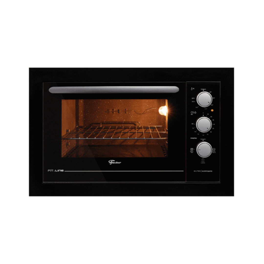 O novo Forno Elétrico de Embutir Fischer Fit Line 48 litros, conta com um novo frontal em aço carbono ou inox, dourador, isolamento térmico total, bandeja para resíduos esmaltada, grade cromada removível, bandeja coletora de resíduos e porta com vidro duplo que impede a fuga de calor e economiza energia. Conta com revestimento interno autolimpante, lâmpada interna, timer com programação de até 120 minutos, controle independente das resistências através do novo manipulador e controle automático de temperatura 50°C a 320°C. Disponível nas cores Preto, Branco e Inox