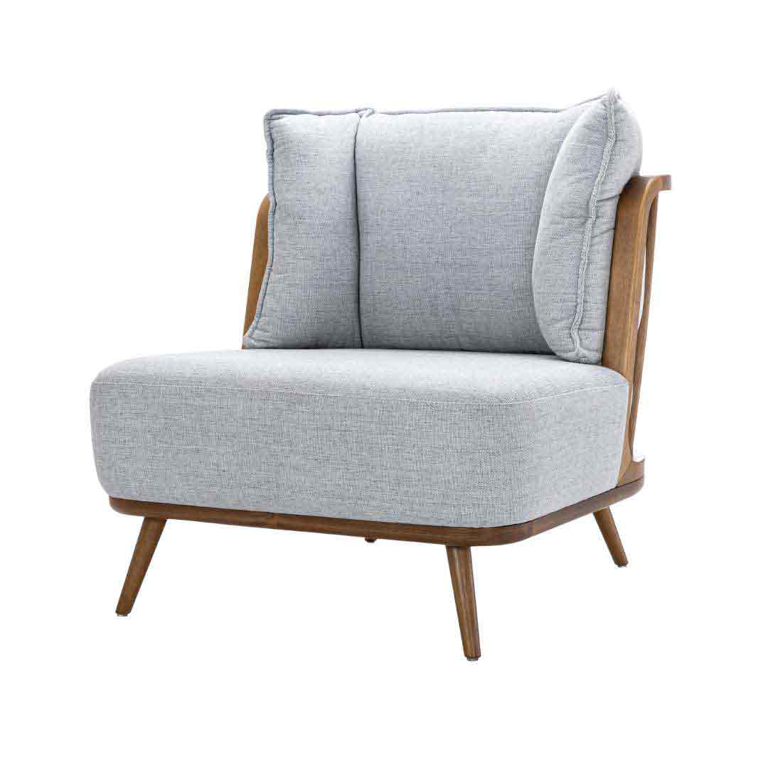 Uma cadeira que inspira conforto e quase abraça o usuário: assim é a Slot. Composta por formas arredondadas e um encosto cuidadosamente projetado para proporcionar aconchego, a cadeira também conta com pernas e encosto de madeira.