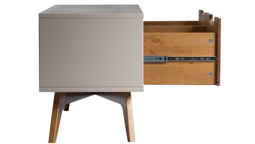 Caixa em MDF. Gavetas e pés em madeira maciça taeda, corrediças telescópicas nas gavetas.