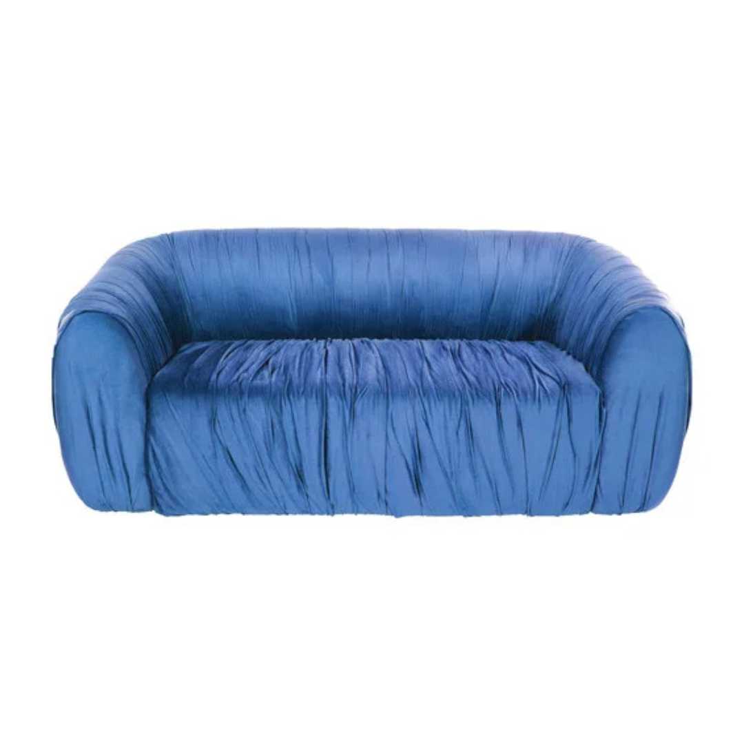 - O Sofá Drapê com sua estrutura sólida, de linhas retas e firmes, sustenta uma tapeçaria rica em detalhes, onde o drapeado do veludo aplicado manualmente cria uma textura fluida que contrasta de forma sofisticada com a rigidez da base