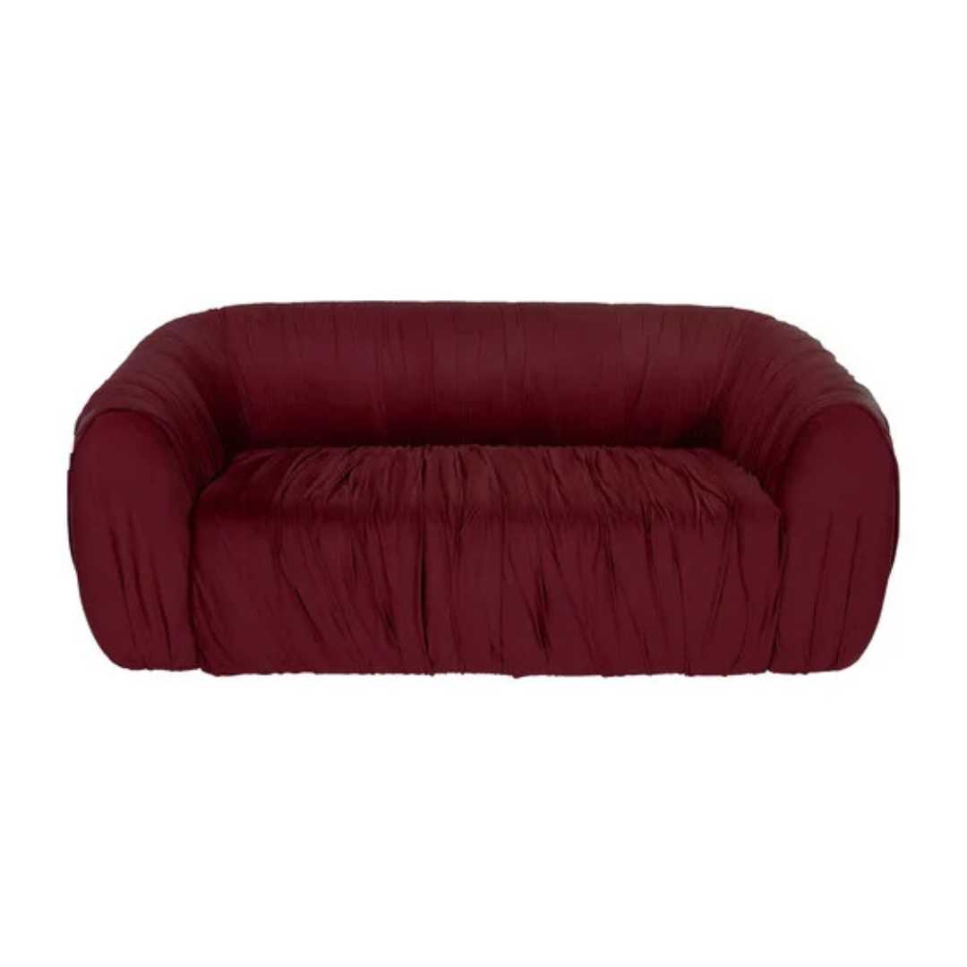 - O Sofá Drapê com sua estrutura sólida, de linhas retas e firmes, sustenta uma tapeçaria rica em detalhes, onde o drapeado do veludo aplicado manualmente cria uma textura fluida que contrasta de forma sofisticada com a rigidez da base