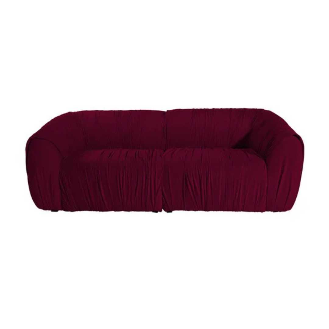 - O Sofá Drapê com sua estrutura sólida, de linhas retas e firmes, sustenta uma tapeçaria rica em detalhes, onde o drapeado do veludo — aplicado manualmente — cria uma textura fluida que contrasta de forma sofisticada com a rigidez da base