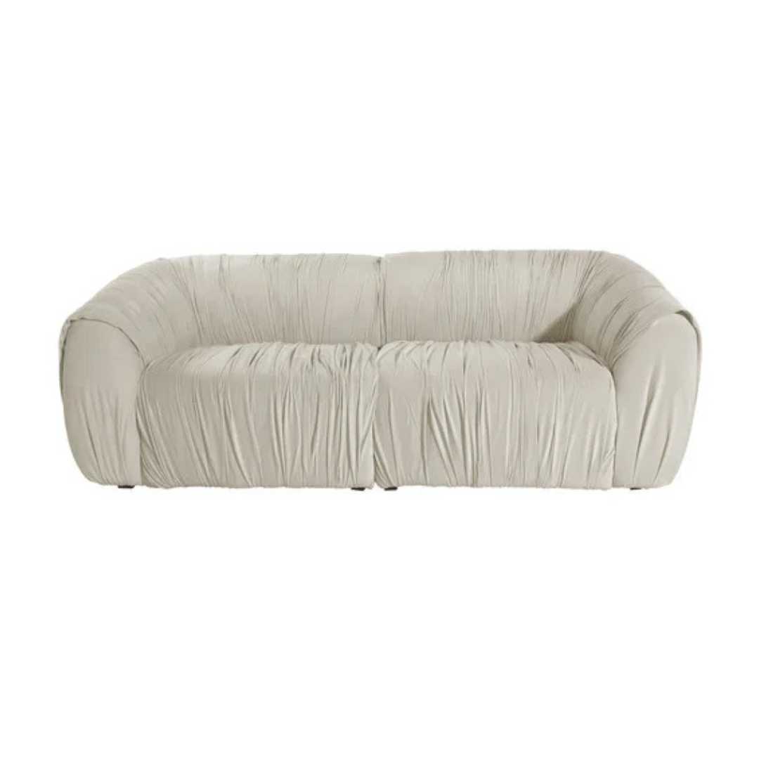 - Feito em veludo, com seu toque macio, brilho sutil e aparência nobre, acrescenta uma camada de luxo tátil e visual à peça. Conhecido por sua durabilidade e conforto térmico, o tecido reforça a sensação de aconchego sem perder a sofisticação. Essa dualidade entre o pesado e o leve, o estático e o dinâmico, faz do sofá não apenas um objeto funcional, mas uma verdadeira escultura no ambiente