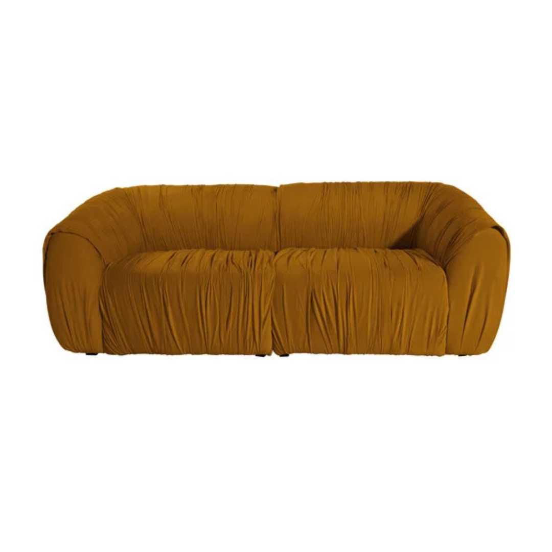 - O Sofá Drapê com sua estrutura sólida, de linhas retas e firmes, sustenta uma tapeçaria rica em detalhes, onde o drapeado do veludo aplicado manualmente cria uma textura fluida que contrasta de forma sofisticada com a rigidez da base