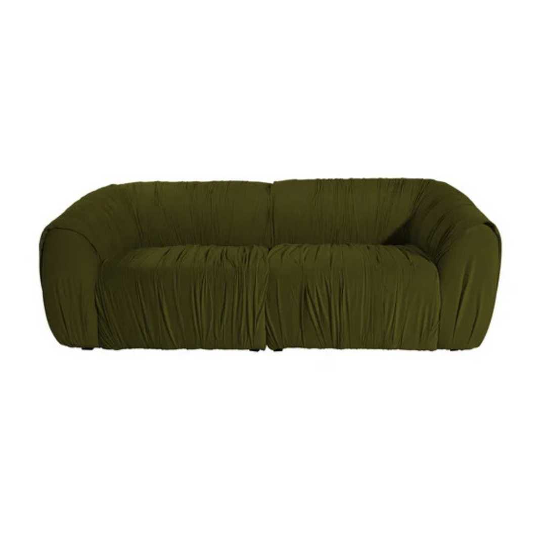 - O Sofá Drapê com sua estrutura sólida, de linhas retas e firmes, sustenta uma tapeçaria rica em detalhes, onde o drapeado do veludo aplicado manualmente cria uma textura fluida que contrasta de forma sofisticada com a rigidez da base